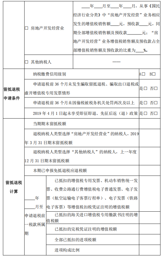 十三、退稅納稅人類型:按照《財政部 稅務總局關于完善增值稅期末留抵退稅政策的公告》(財政部 稅務總局公告 2025 年第 7 號,以下簡稱 7 號公告)第一條第一項規定申請留抵退稅的納稅人,根據其“制造業”“科學研究和技術服務業”“軟件和信息技術服務業”“生態保護和環境治理業”中銷售收入占比最高的一項選擇;按照 7 號公告第一條第二項規定申請留抵退稅的納稅人,選擇“房地產開發經營業”;按照 7 號公告第一條第三項規定申請留抵退稅的納稅人,選擇“其他納稅人”。退稅納稅人類型選擇“制造業”“科學研究和技術服務業”“軟件和信息技術服務業”或“生態保護和環境治理業”的納稅人,應填寫“ 年 月至 年 月,從事《國民經濟行業分類》中‘制造業’‘科學研究和技術服務業’‘軟件和信息技術服務業’‘生態保護和環境治理業’業務相應發生的增值稅銷售額 元,同期全部增值稅銷售額 元,占比 %。”如申請退稅前經營期滿 12 個月,本欄起止時間填寫申請退稅前 12 個月的起止時間,本欄銷售額填寫申請退稅前 12 個月的銷售額;如申請退稅前經營期不滿 12 個月但滿 3 個月的,本欄起止時間填寫實際經營期的起止時間,本欄銷售額填寫實際經營期的銷售額。退稅納稅人類型選擇“房地產開發經營業”的納稅人,應填寫“ 年 月至 年 月,從事《國民經濟行業分類》中‘房地產開發經營’業務相應發生的增值稅銷售額 元,預收款 元,同期全部增值稅銷售額及預收款元,‘房地產開發經營’業務增值稅銷售額及預收款占全部增值稅銷售額及預收款的比重為 %。”如申請退稅前經營期滿 12 個月,本欄起止時間填寫申請退稅前 12 個月的起止時間,本欄銷售額和預收款填寫申請退稅前 12 個月的銷售額和預收款;如申請退稅前經營期不滿 12 個月但滿 3 個月的,本欄起止時間填寫實際經營期的起止時間,本欄銷售額和預收款填寫實際經營期的銷售額和預收款。