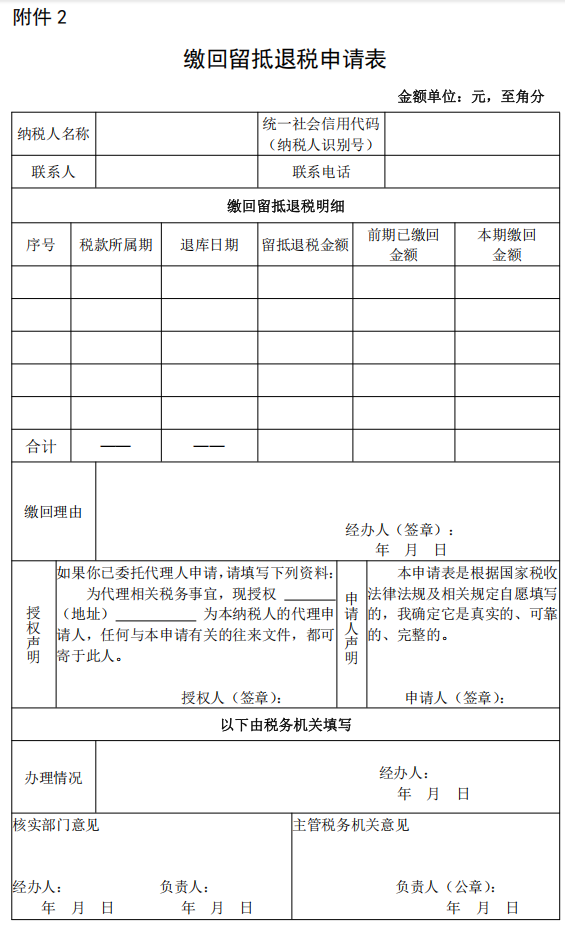 一、本表適用于納稅人按照規定,申請繳回已退還的增值稅期末留抵稅額退稅款。